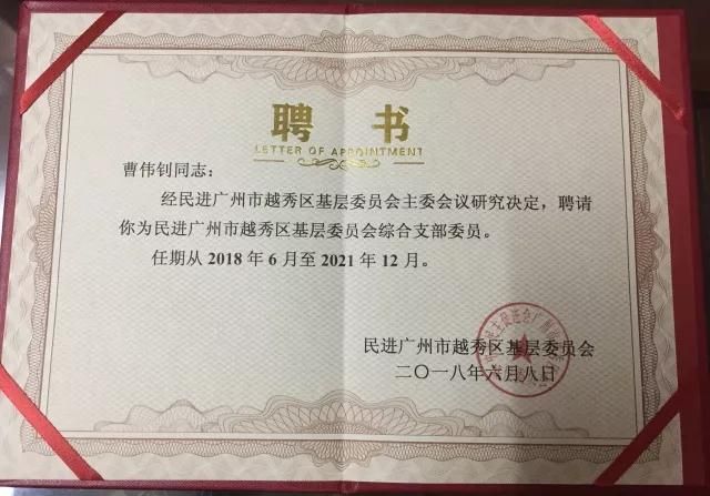 2018年6月8日,中国民主促进会广州市越秀区基层委员会举行民进广州市越秀区基层委员会综合支部的委员选举工作,经过公开、公平、公正的选举,曹伟钊律师成功当选新一届的综合支部委员。