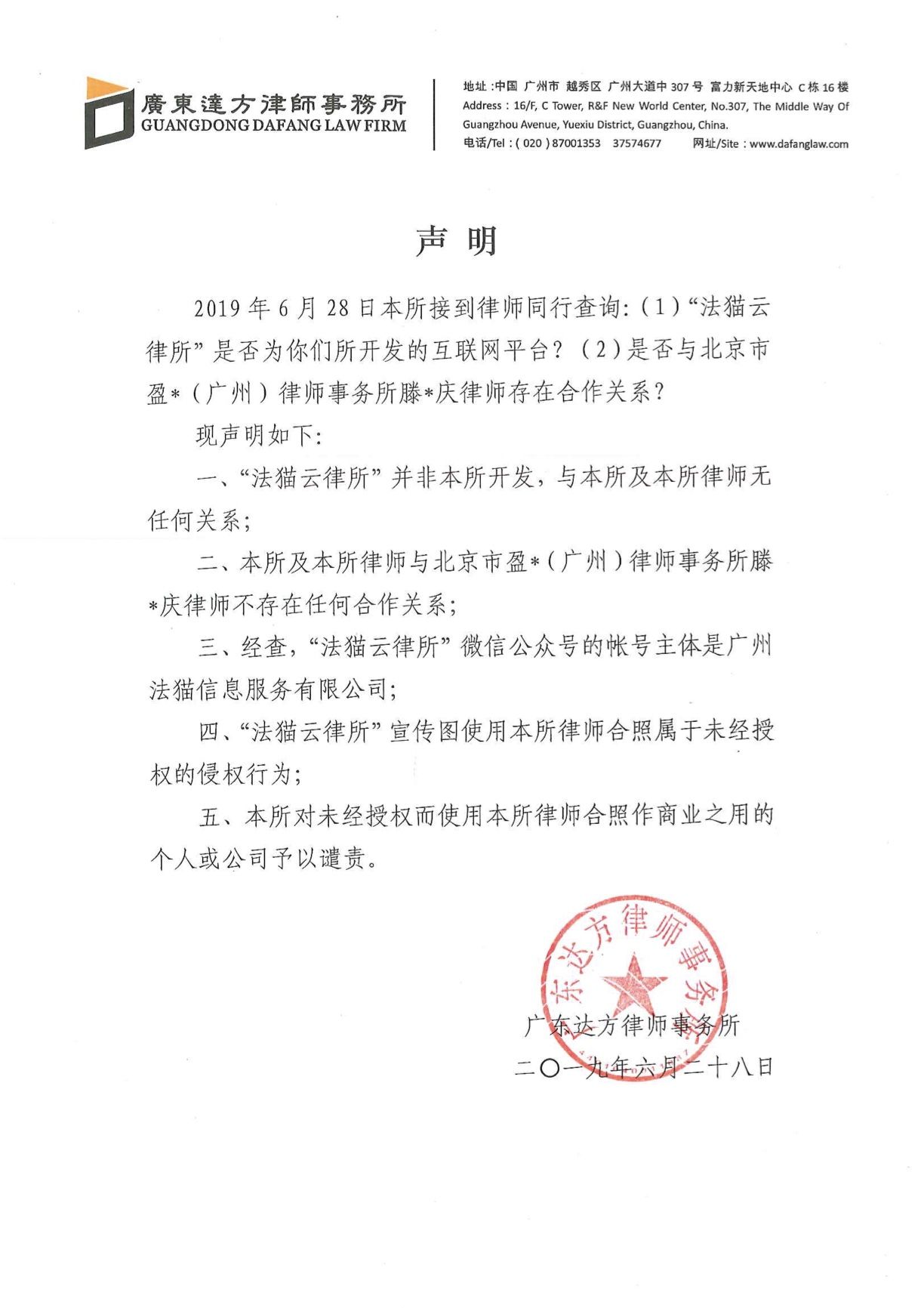 2019年6月28日本所接到律师同行查询:(1)“法猫云律所”是否为你们所开发的互联网平台?(2)是否与北京市盈*(广州)律师事务所滕*庆律师存在合作关系?