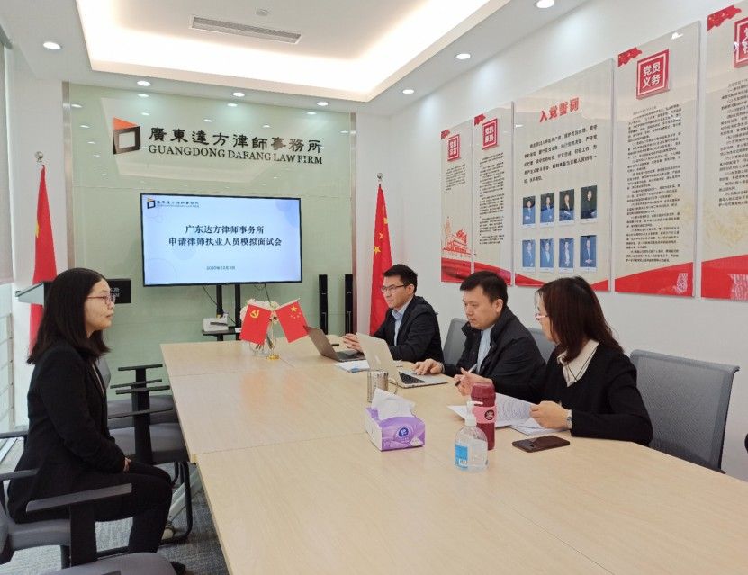 模拟面试会由我所申请律师执业人员管理工作小组曹伟钊、邓学明、汤艳萍三位律师组成面试考评小组,为我所实习律师黄晓君、何彩莲进行一次全流程模拟面试。考核小组严格按照面试考核程序、评分标准对实习律师进行提问,以高标准来检测实习律师的专业素质和应变能力,并就实习律师在考核过程中存在的问题进行细心指导。